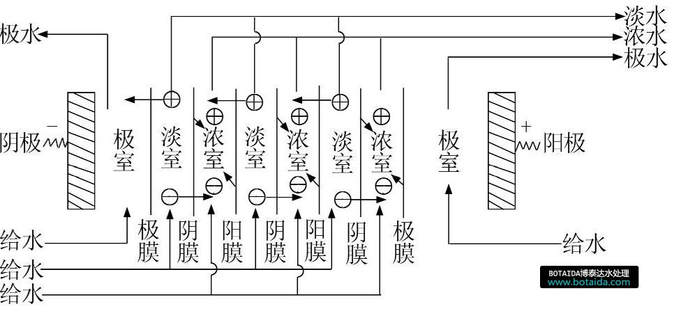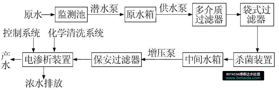 電滲析脫鹽裝置主要由預處理系統(tǒng)和電滲析器組成。