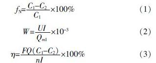 COD:Hach試劑法;氨氮:Hach試劑法;堿度:鹽酸滴定法;硬度:EDTA滴定法;氯離子:硝酸銀滴定法;電導率:電導率儀測量;濁度:濁度計測量;pH:pH計測量;另外需要記錄的裝置運行參數(shù)包括流量、壓強、運行電壓、電流等。脫鹽率、耗電量、電流效率分別按照式(1)~式(3)計算。
