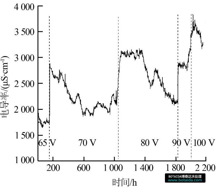 電滲析脫鹽是靠電能來遷移水中己解離的離子,因此運行電壓和水中含鹽量成正比。從圖3可以看出,進水電導率在1 800~3 800 μS/cm波動,在第182小時時進水電導率突然從1 700 μS/cm升高至 2 800 μS/cm,最高電導率出現(xiàn)在運行時間第2 052小時,為3 750 μS/cm,因此需要根據(jù)進水電導率的變化不斷調(diào)整運行電壓。另一方面,隨著電滲析器的運行,離子交換膜表面污染物逐漸累積,導致電阻增大,因此為保證脫鹽率以及產(chǎn)水水質(zhì),也需要逐步提升運行電壓。因此,在整個試驗期間,運行電壓逐步從65 V調(diào)整至100 V,以保證產(chǎn)水水質(zhì)滿足循環(huán)水補水要求。
