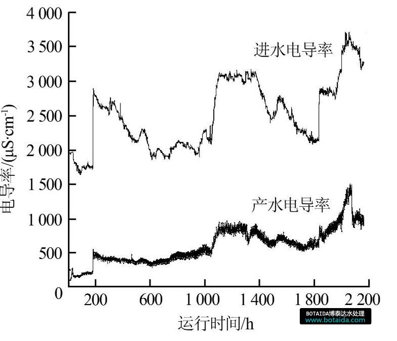 從圖4可以看出,在試驗前1 000 h內(nèi),產(chǎn)水電導率在500 μS/cm左右,到試驗后期產(chǎn)水電導率基本維持在1 000 μS/cm上下。