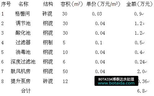 本工藝總裝機(jī)容量為9kw,常用容量3.5kw,每度電按0.6元計(jì),則日耗電費(fèi)50.4元,年耗電費(fèi)18396元(以1年365個(gè)工作日計(jì),下同),折算1m3污水耗電0.42元。