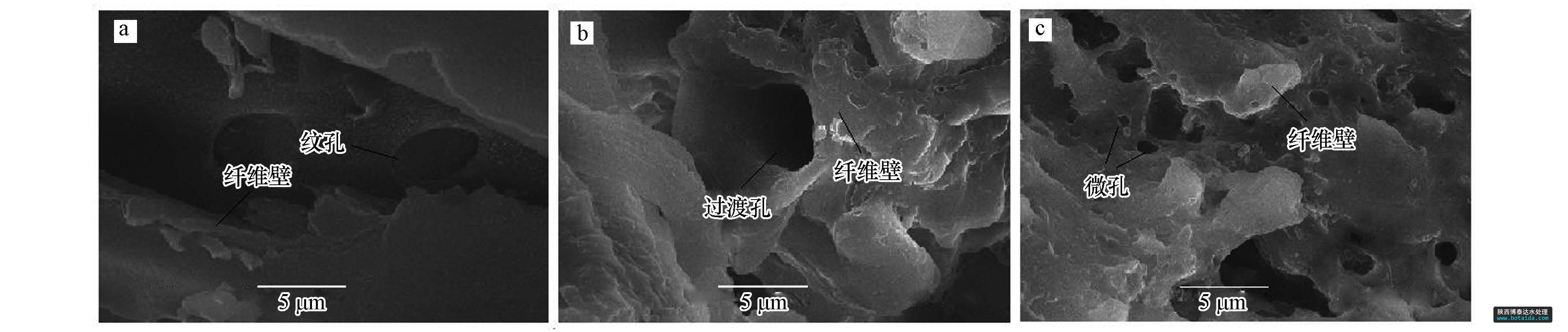 用JSM-6380LV掃描電鏡對原木粉、芐基化木粉、多微孔芐基化木粉進(jìn)行了分析(圖 4).對比原木粉(圖 4a)和芐基化木粉(圖 4b)發(fā)現(xiàn),原木粉中封閉的紋孔清晰可見,纖維壁堅(jiān)硬、平整.原木粉經(jīng)芐基化改性后(圖 4b),紋孔膜破裂,纖維壁膨松、柔軟,過渡孔清晰可見.芐基化木粉經(jīng)水熱處理后得到多微孔芐基化木粉(圖 4c),纖維壁明顯破裂,產(chǎn)生了許多微孔.這一方面是由于水蒸汽分子具有高能量、高穿透力,可將芐基化木粉纖維壁上的微纖絲部分沖破,并造成斷裂,產(chǎn)生新的微孔或超微孔(王瑀,2008);另一方面,在高熱水蒸汽分子沖擊下,芐基化木粉結(jié)晶區(qū)中纖維素的氫鍵斷裂,纖維分子從彎曲狀態(tài)變成伸展?fàn)顟B(tài),纖維壁伸展開來,產(chǎn)生了明顯的“膨化效應(yīng)”,有效地?cái)U(kuò)大了芐基化木粉的過渡孔和微孔.此外,水熱處理中所加乳化劑OP-10能迅速乳化從纖維壁間釋放出的膠狀物質(zhì),有利于及時清洗疏通孔道.由此可見,木粉經(jīng)芐基化及水熱處理后,木材纖維壁變得膨松,產(chǎn)生大量的微孔或超微孔,有效地?cái)U(kuò)大了芐基化木粉吸附重金屬離子的比表面積,同時使纖維素和半纖維素分子上的羥基更加裸露,增加了對重金屬離子絡(luò)合的羥基數(shù)目,從而提高了對重金屬離子的吸附性能.