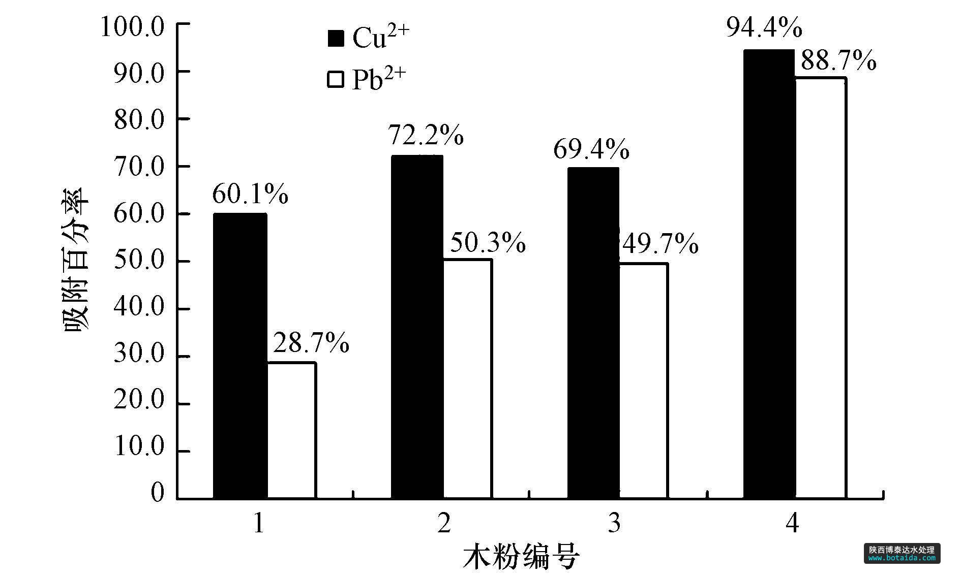 圖6 不同木粉對Cu2+和Pb2+吸附百分率(1.原木粉;2.脫脂木粉;3.芐基化木粉;4.多微孔芐基化木粉)