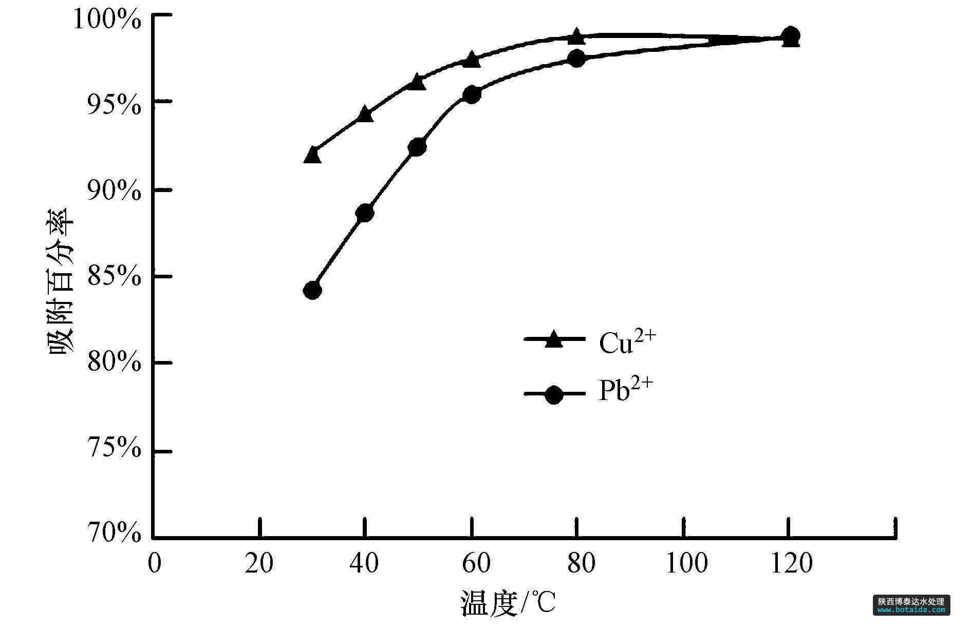 圖10 吸附溫度對Cu2+和Pb2+吸附百分率的影響