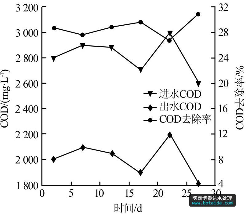 由圖 3可以看出,水解酸化工藝對(duì)COD的去除率基本穩(wěn)定在20 %左右,與文獻(xiàn)〔6〕報(bào)道的10%~20%比較接近,出水COD約為2 800 mg/L。