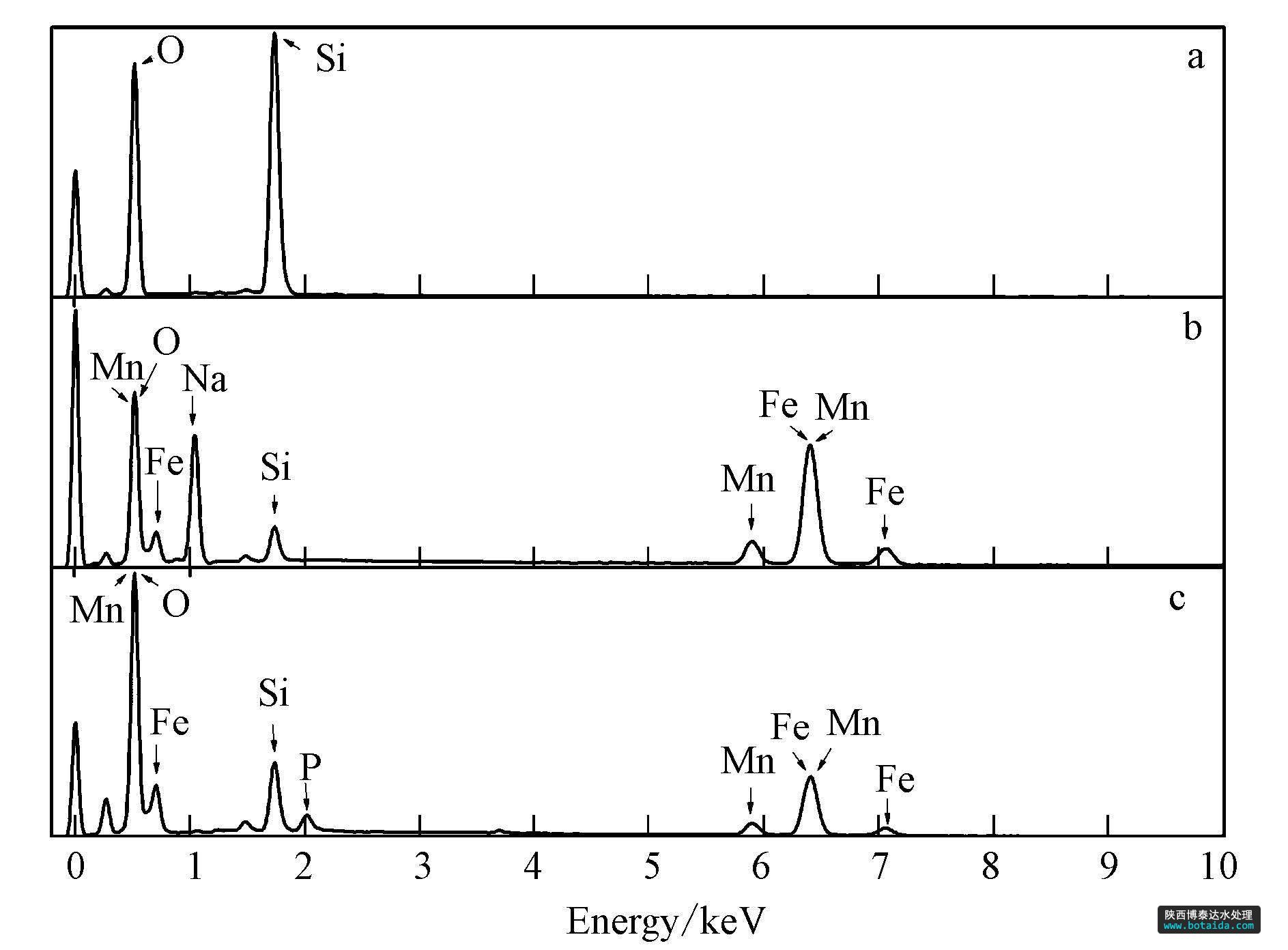海砂與包覆海砂磷吸附前后的EDAX圖譜如圖 2所示. 海砂以硅元素與氧元素為主要成分,包覆鐵錳復(fù)合氧化物后,出現(xiàn)了明顯的鐵元素與錳元素的特征峰,表明鐵錳復(fù)合氧化物包覆在海砂的表面. 吸附磷后包覆海砂的EDAX圖譜又出現(xiàn)了磷元素的特征峰,表明鐵錳復(fù)合氧化物包覆海砂對溶液中的磷具有吸附性能.