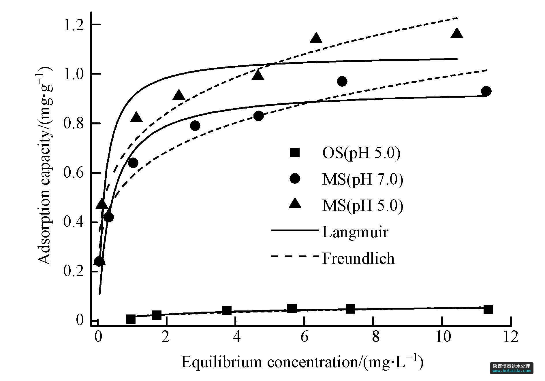 對磷吸附結(jié)果分別用Langmuir模型式(2)與Freundlich模型式(3)進(jìn)行擬合.