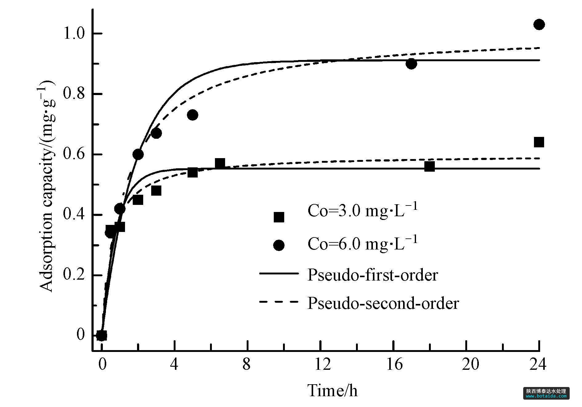 式中,qt和qe分別為t時刻和平衡態(tài)時的吸附量(mg · g-1),k1為準(zhǔn)一級吸附速率常數(shù)(h-1),k2為準(zhǔn)二級吸附速率常數(shù)(g · mg-1 · h-1).
