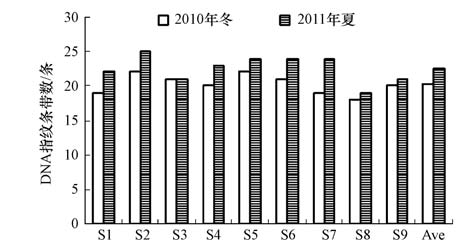 1)大亞灣海域浮游細(xì)菌DNA指紋條帶豐富,在2010年冬和2011年夏的調(diào)查中共分別得到32和33條DNA指紋條帶,每個(gè)樣品的DNA條帶數(shù)為18~25條.
