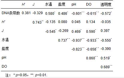 從浮游細(xì)菌與環(huán)境因子之間的相關(guān)關(guān)系可以看出,DNA指紋條帶數(shù)與環(huán)境因子密切相關(guān),其中與溫度和鹽度明顯正相關(guān)(p<0.05),而與pH、DO以及透明度明顯負(fù)相關(guān)(p<0.05或p<0.01),結(jié)果說(shuō)明高溫高鹽可促進(jìn)浮游細(xì)菌多樣性,而pH、DO、透明度下降等水質(zhì)惡化現(xiàn)象則可降低浮游細(xì)菌的種類(lèi)豐富程度.H′值僅與J值呈明顯正相關(guān);而J則與水溫明顯負(fù)相關(guān),與pH和DO明顯正相關(guān).各種環(huán)境因子之間幾乎均呈現(xiàn)出明顯的相關(guān)關(guān)系,其中水溫與pH、DO、透明度均明顯負(fù)相關(guān)(p<0.05或p<0.01),說(shuō)明夏季水質(zhì)較冬季差;而DO又與pH和透明度明顯正相關(guān)(p<0.01).