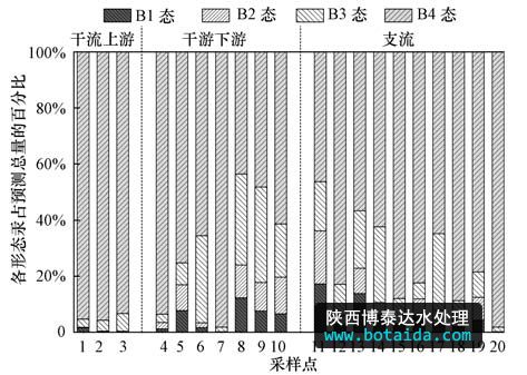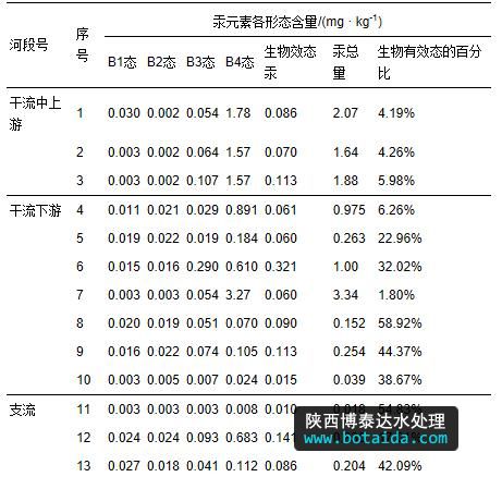 由圖 2可知,涼水河表層沉積物中各形態(tài)汞含量存在差異,在涼水河干流上游、干流下游及支流表層沉積物中均以B4態(tài)為主要賦存形態(tài),其中B4態(tài)所占比例均值分別為94.81%、69.41%和74.89%,平均百分比為75.96%;B3態(tài)所占比例均值分別為4.40%、18.40%和13.20%,平均百分比為13.70%.總體來(lái)看,在涼水河干流上游、干流下游及支流表層沉積物中,汞各形態(tài)所占比例大小順序均為B4>B3>B2>B1.涼水河表層沉積物中汞主要以B4態(tài)存在,表明涼水河表層沉積物中汞的生物可利用性低.