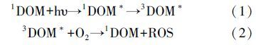 溶解性有機(jī)質(zhì)(DOM)含有發(fā)色基團(tuán),是重要的天然光敏劑,在紫外輻射或太陽(yáng)光照射下,單線態(tài)(state DOM singlet,1DOM)分子吸收光能先轉(zhuǎn)化為激發(fā)單線態(tài)(excited state DOM singlet,1DOM*),進(jìn)而轉(zhuǎn)化為激發(fā)三線態(tài)(excited state DOM triplets,3DOM*),進(jìn)一步與溶解氧分子發(fā)生一系列反應(yīng),產(chǎn)生活性氧物質(zhì)(reactive oxygen species,ROS),如羥基自由基(hydroxyl radical,· OH)、單線態(tài)氧(singlet oxygen,1O2)、超氧化物(superoxide,O2-)等(見(jiàn)反應(yīng)式(1)、(2.這些活性氧物質(zhì)可以誘導(dǎo)有機(jī)污染物光降解,同時(shí),DOM也會(huì)與目標(biāo)化合物競(jìng)爭(zhēng)光吸收,或猝滅目標(biāo)化合物的激發(fā)態(tài),DOM對(duì)有機(jī)污染物的光解具有光敏化和光屏蔽雙重作用(Chen et al., 2009;,這與DOM的來(lái)源、組成、化學(xué)結(jié)構(gòu)等特點(diǎn)密切相關(guān).因此,溶解性有機(jī)質(zhì)在水生生態(tài)系統(tǒng)光化學(xué)中扮演重要角色,可以影響有機(jī)污染物的環(huán)境行為和生態(tài)風(fēng)險(xiǎn).