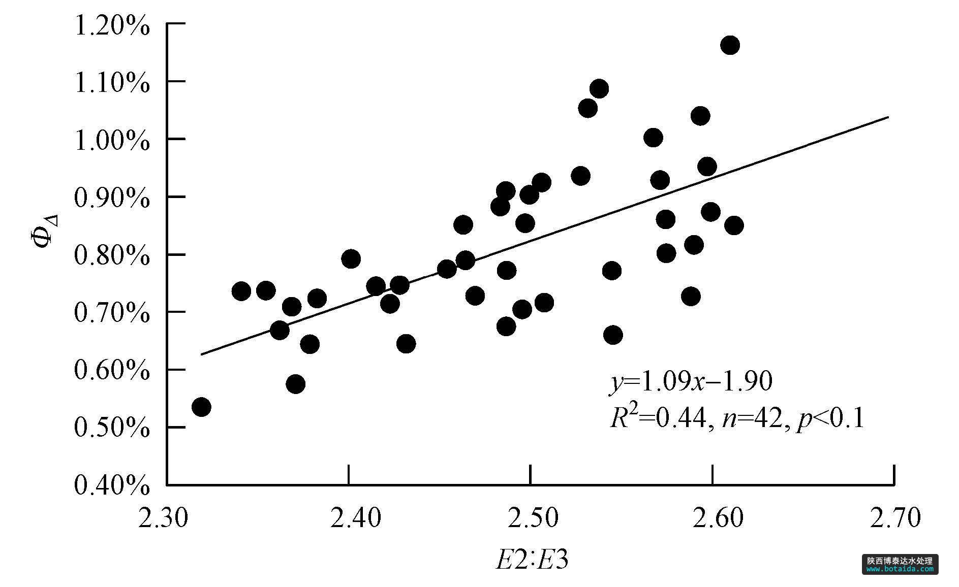 本研究選光譜特征值E2:E3與ФΔ值進(jìn)行相關(guān)分析,所得關(guān)系圖見(jiàn)圖 6.量子產(chǎn)率ФΔ與E2:E3顯著正相關(guān)(p<0.01),線性擬合所得方程為y=1.09x-1.90,R2=0.44.Petersone et al.(2012)針對(duì)水體DOM的研究結(jié)果顯示,ФΔ與E2:E3之間成正相關(guān)(y=0.196 x+0.605,R2=0.592).本研究中ФΔ與E2:E3的線性相關(guān)擬合斜率(1.09)顯著大于Petersone et al.(2012)研究結(jié)果(0.196),可能因本研究腐殖酸與他人研究樣品相比有機(jī)質(zhì)類(lèi)型不同且較為單一所致.E2:E3作為表征DOM的芳香性和分子量的特征值(Peuravuori and Pihlaja, 1997;Dalzell et al., 2009),其差異可以反映有機(jī)質(zhì)類(lèi)型的不同.Petersone et al.(2012)的研究中5﹤E2:E3﹤25,有機(jī)質(zhì)類(lèi)型多樣,以小分子量的DOM為主;而本研究中E2:E3值較小且范圍窄(2.32~2.61),有機(jī)質(zhì)類(lèi)型單一,腐殖酸分子量大,芳構(gòu)化程度高.這表明,存在單線態(tài)氧量子產(chǎn)率隨有機(jī)質(zhì)分子量減小及芳香性減弱而增大的趨勢(shì),且對(duì)于高分子量的DOM,該趨勢(shì)更為顯著.
