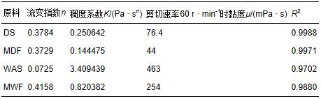 根據(jù)式(2),測定不同轉(zhuǎn)速條件下的原料黏度,由冪律方程擬合得到4種發(fā)酵原料的流變特性參數(shù),如表 1所示.流變指數(shù)n是衡量實際流體與牛頓流體相似程度的指標.當n為1時,此時流體為牛頓流體;n小于1時,流體為假塑性或者剪切變稀流體;n大于1時,流體為膨脹塑性或者剪切增稠流體.從表 1中可以看出,4種原料的流變指數(shù)n都小于1,在 TS 為 5%、溫度為35 ℃條件下都為假塑性流體(陳志平等,2004).造成這4種原料呈現(xiàn)明顯的假塑性流體性質(zhì)的原因可能是污泥主要由微生物聚集體(即活性污泥菌膠團)、廢水帶入的無機性沉渣、少量未降的有機物等大分子物質(zhì)和大量的水分組成,污泥混合液中大分子物質(zhì)的存在會使原料在受到剪切后發(fā)生分子的重排,分子趨向與流動方向一致,流動阻力下降,從而使表觀黏度在剪切速率增大時減小(劉刈等,2009).4種原料中WAS的流變指數(shù)最小,剩餐的最大,這說明在 TS 為 5%、溫度為35 ℃條件下4種原料中MWF的流變性質(zhì)最接近牛頓流體,而WAS偏離牛頓流體的程度最大.此外,4種原料中MDF的黏度最小,WAS的黏度最大,而流體稠度系數(shù)作為黏度的量度,使得通過擬合的得到的4種原料的流體稠度系數(shù)中MDF最小,WAS最大.