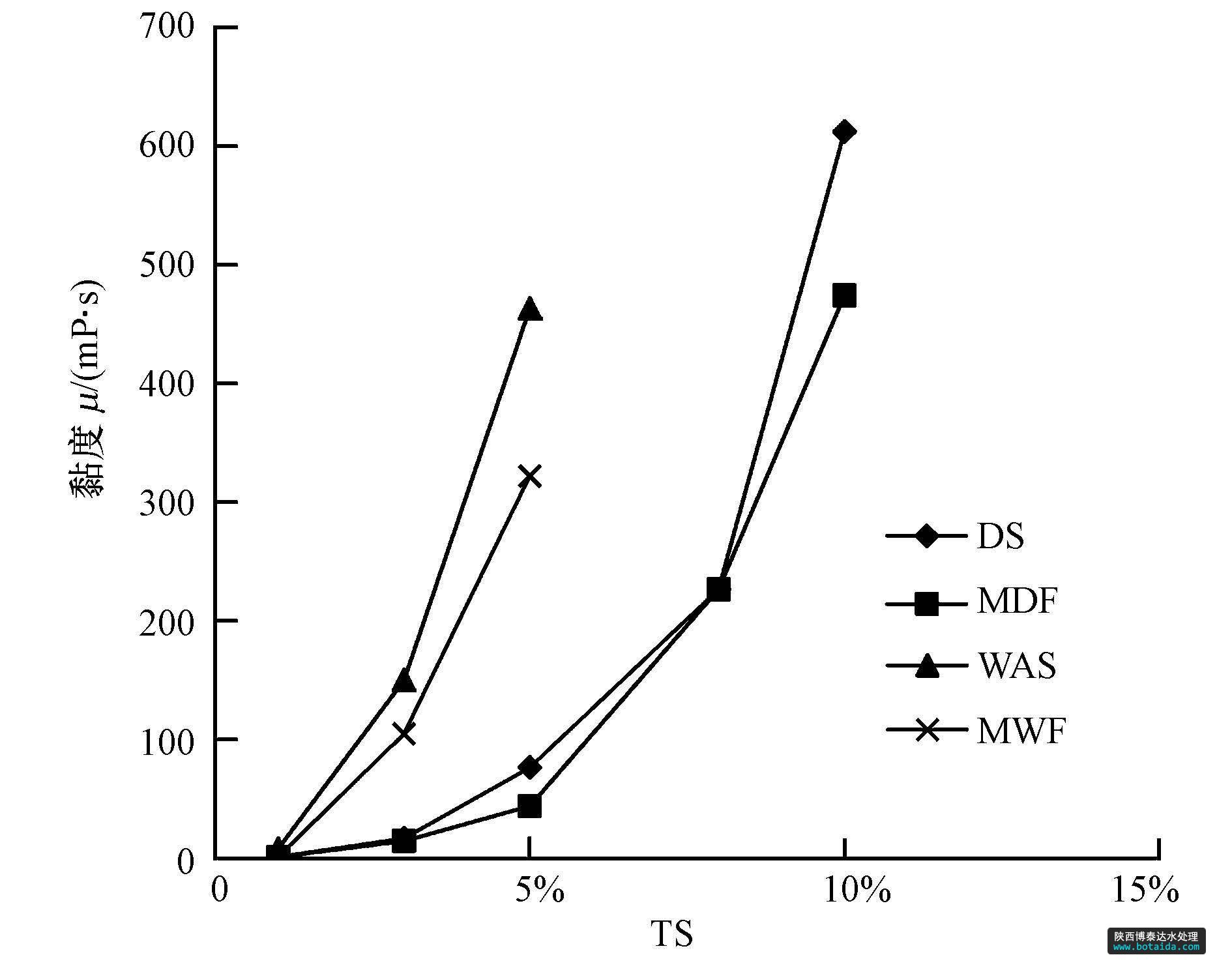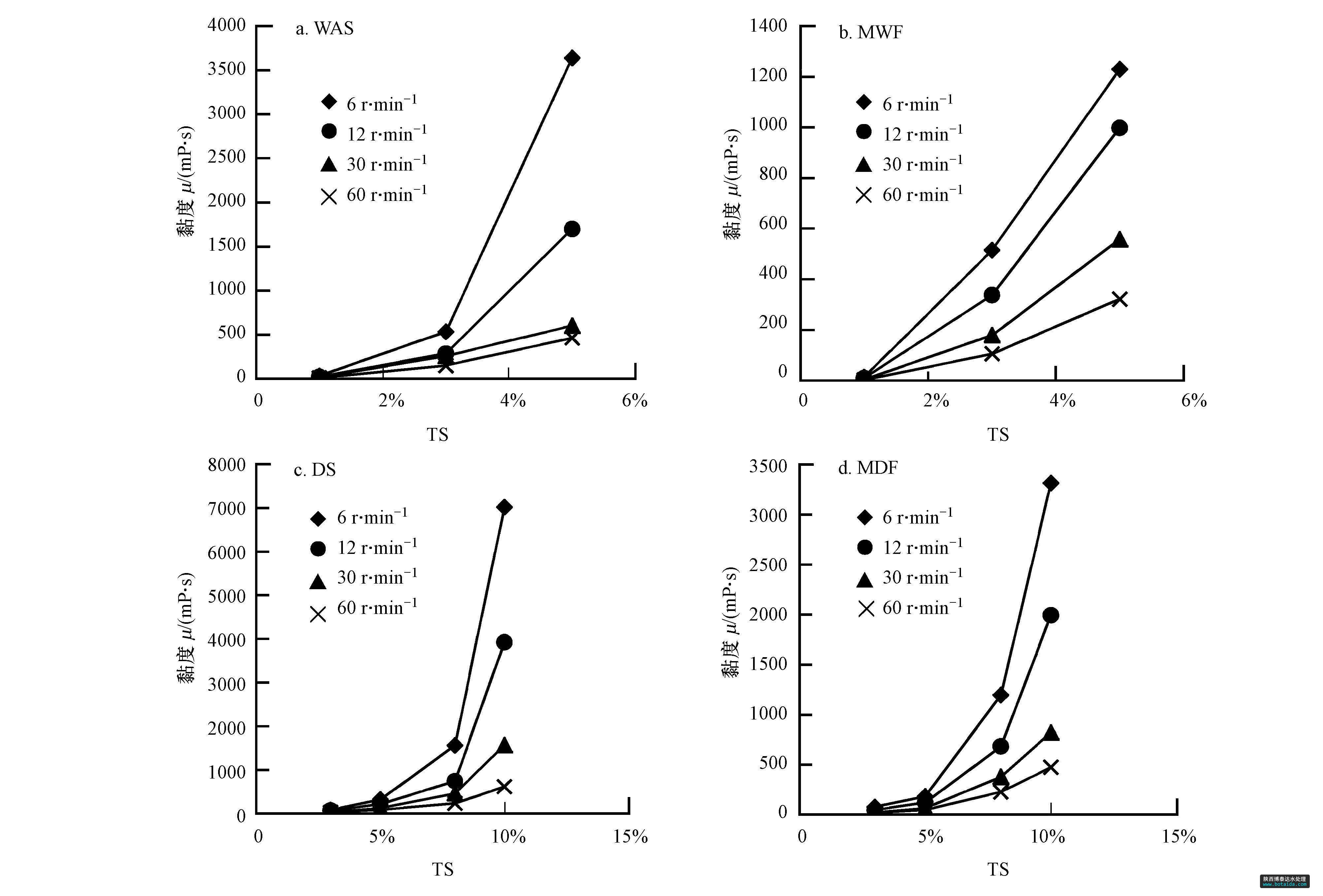 根據(jù)原料的起始 TS濃度,用蒸餾水分別將DS、DS與餐廚垃圾按TS 4 ∶ 1混合的混合物(the mixture of dewatered sludge and food waste,以下簡稱MDF)配制成TS濃度分別為1%、3%、5%、8%和10%的混合液裝于500 mL 燒杯中;用恒溫水浴鍋控制混合液溫度為35 ℃,樣品經(jīng)過攪拌之后,用旋轉(zhuǎn)黏度計(NDJ5-S,中國上海)測量 4 個攪拌轉(zhuǎn)速(6、12、30、60 r · min-1)下的黏度,待讀數(shù)基本穩(wěn)定時,每10 s 讀數(shù)1次,共讀取7個黏度值,取算術(shù)平均值.