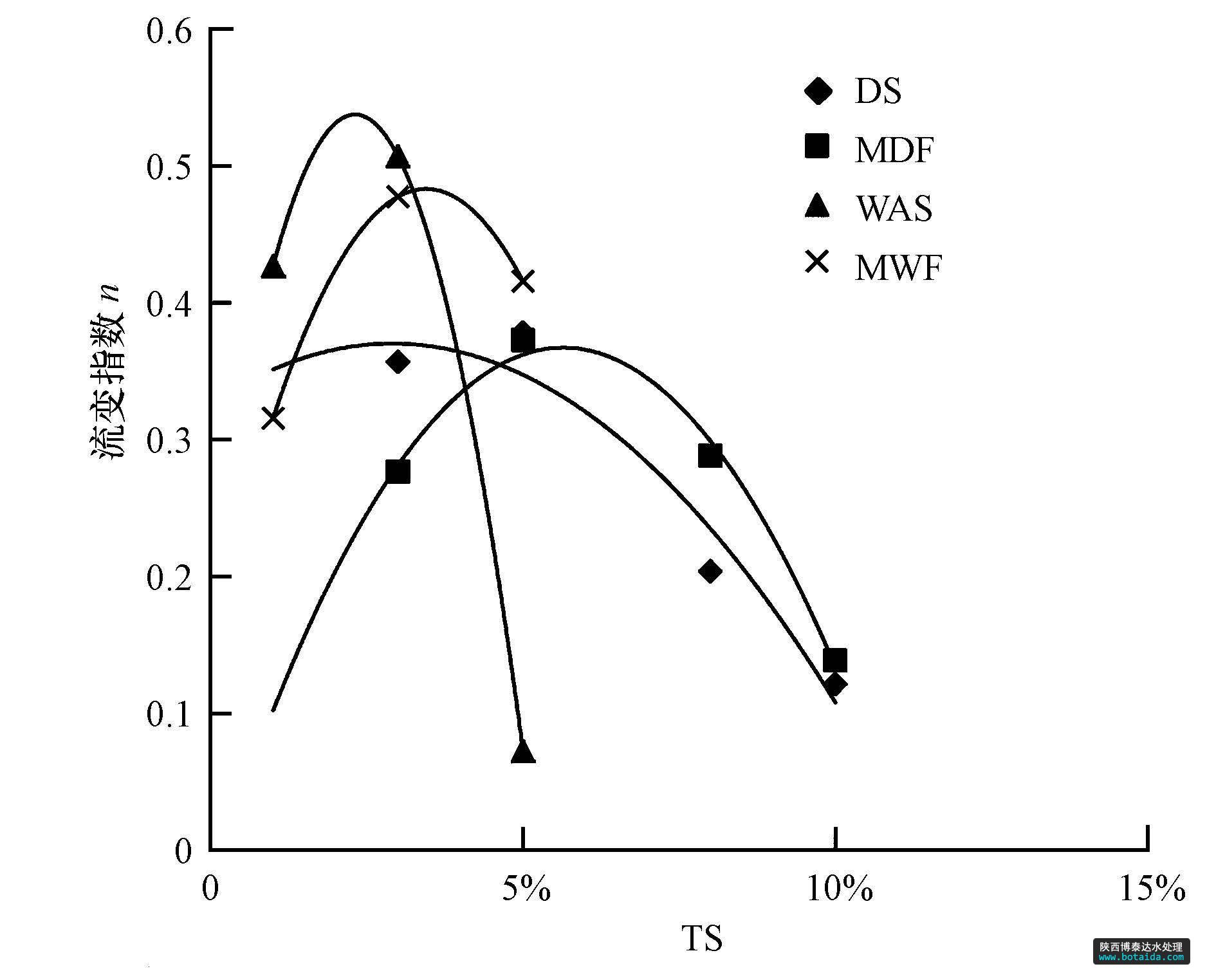 2)隨著固體濃度由1%升高到10%,4種厭氧消化原料的流變指數(shù)呈先升高后降低的趨勢,WAS和MDF在TS=3%時流變指數(shù)最大,而DS和MDF在TS=5%時流變指數(shù)最大.