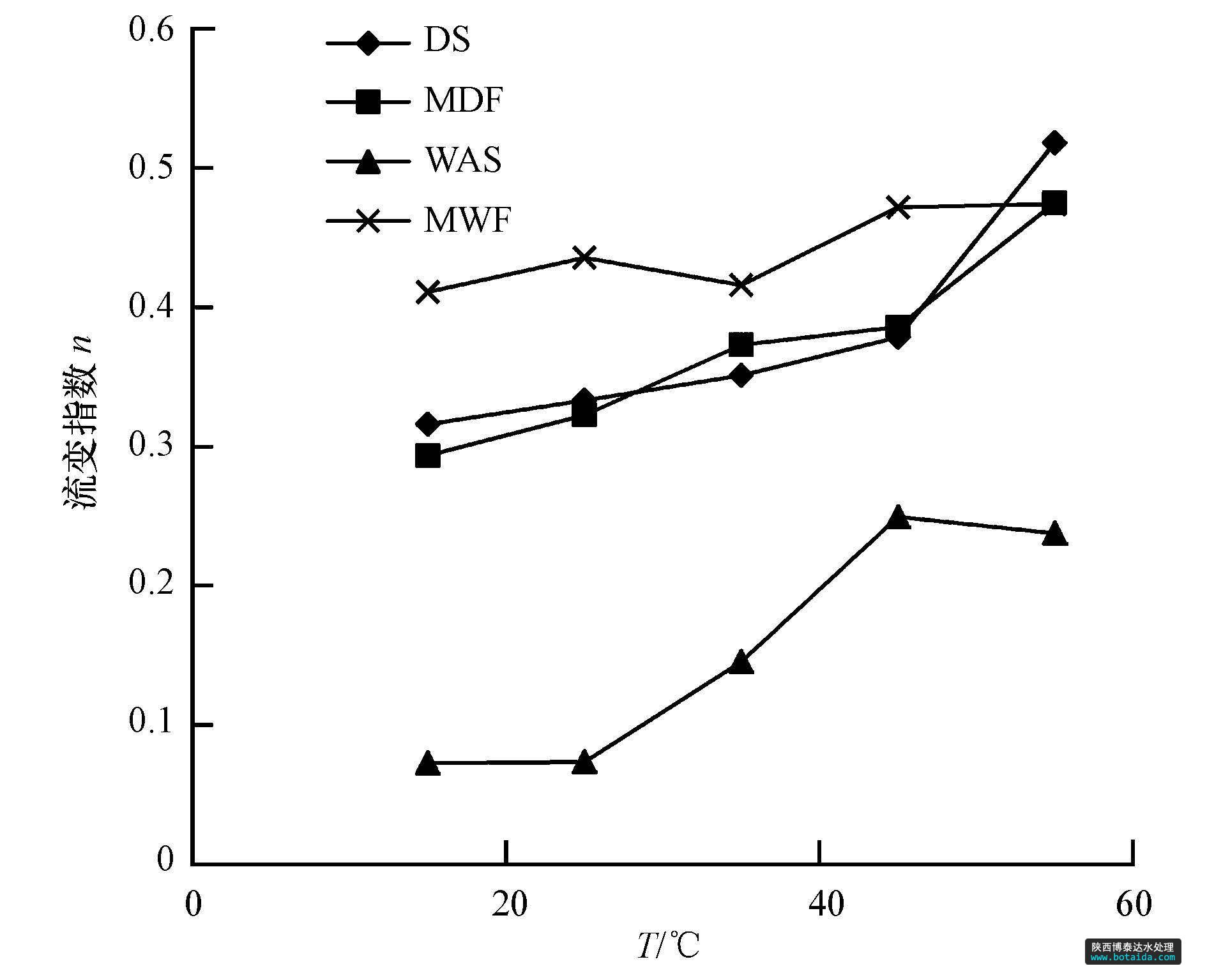 TS為5%時4種原料流變指數(shù)隨溫度的變化情況如圖 5所示.由圖 5可以看出4種原料的流變指數(shù)隨著溫度的升高而增大.這說明溫度越高,這4種原料的流變性質(zhì)越接近牛頓流體.在這4種原料中,可以明顯的看出WAS的流變指數(shù)最小,偏離牛頓流體的程度最大;MWF的流變指數(shù)最大,最趨向于牛頓流體.通過對原始餐廚垃圾的流變特性分析,含水率為81.54%的未稀釋餐廚的黏度為1814 mPa · s,流變指數(shù)為0.6177,流變指數(shù)大于本文所研究的4種原料的任何1種;可能是餐廚垃圾較純污泥更趨向于牛頓流體,餐廚垃圾的加入導致污泥流變特性的改變,使得混合液較純泥更趨向于牛頓流體.DS的流變指數(shù)升高的幅度較大,其余3種原料升高的幅度較小.這說明相對于其他3種原料,DS的黏度對溫度變化更敏感。