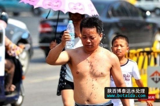 2014年7月22日,實(shí)拍濟(jì)南40℃高溫市民百態(tài) 礦泉水澆頭王府池子游泳 圖為濟(jì)南市民街頭用礦泉水澆頭解暑。