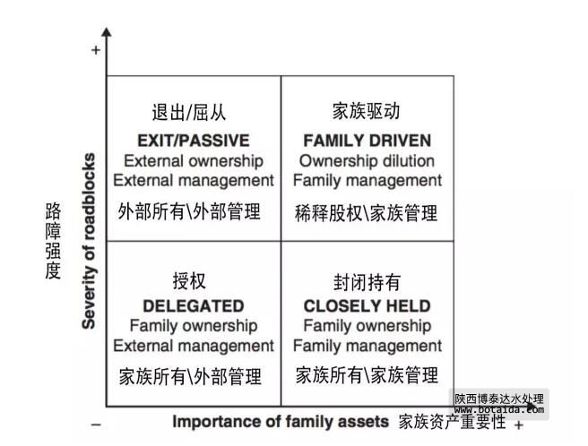 家族企業(yè)路線圖為家族可以選擇的路線提供了一個非常簡明的圖解。通常,它能做出如下預測:家族資產(chǎn)漸趨減少的企業(yè)應該更多地尋求外部管理的介入,而目前以及未來面臨重大障礙的企業(yè),則應該積極尋求所有權結構的改革,以便將障礙可能造成的損失減小到最低。