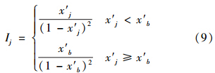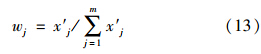 式中,Ij為由式(10)或式(11)計算得到的指標(biāo)j的引力指數(shù)值;wj為指標(biāo)j的歸一化權(quán)值,即滿足∑ m j=1 wj=1,它可以視實際問題需要,采用某種方法確定.一般情況下,只要各指標(biāo)的規(guī)范值x′j差異不大,可視各指標(biāo)為等權(quán)即可;但若最大指標(biāo)規(guī)范值x′j,max與最小指標(biāo)規(guī)范值x′j,min差異較大,則可采用如式(13)所示的對各指標(biāo)規(guī)范值x′j的線性加權(quán)計算權(quán)值.