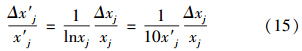 若n固定,將Sc對x′j求導(dǎo),并令S′c=0,得x′j=-1≈0.4142時,Sc有極小值0.5828n.由于變換式(2)~(7)中,對多數(shù)指標(biāo)只取n=±2、±1、±0.5.而公式(10)和式(11)中,x′j 取值范圍為x′j∈[0,0.5](對水體),x′j∈[0,0.4](對空氣).當(dāng)n為上述值時,x′j 分別取為如表 4所示值時,由式(21)計算得靈敏度Sc值如表 4所示.