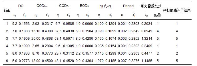 2008年圖們江干流6個斷面的6項地表水水質(zhì)指標(biāo)監(jiān)測數(shù)據(jù)cj(唐立新等,2010),以及由式(1)和式(2)計算得到的指標(biāo)規(guī)范值x′j如表 5所示.對斷面2和3,采用式(13)對引力指數(shù)值進(jìn)行加權(quán)計算;其余斷面在視指標(biāo)為等權(quán)的情況下,用式(10)和式(12)計算得到各監(jiān)測點水質(zhì)引力綜合指數(shù)值,并根據(jù)表 3中3類陸地水體的引力綜合指數(shù)值的分級標(biāo)準(zhǔn)做出水質(zhì)類別判斷結(jié)果(表 5).表 5中還列出了參考文獻(xiàn)(唐立新等,2010)中用密切值法作出的評價結(jié)果.可以看出,利用引力普適指數(shù)公式和用密切值法對6個斷面水質(zhì)做出的評價結(jié)果,完全一致.