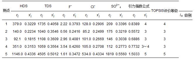 豐縣5個監(jiān)測點的5項地下水指標(biāo)監(jiān)測數(shù)據(jù)cj(劉洪等,2009),以及由式(1)和式(3)計算得到的指標(biāo)規(guī)范值x′j如表 6所示.在視各指標(biāo)為等權(quán)情況下,用式(10)和式(12)計算得到各監(jiān)測點水質(zhì)引力綜合指數(shù)的指數(shù)值,并根據(jù)表 3中3類陸地水體的綜合指數(shù)值分級標(biāo)準(zhǔn)做出水質(zhì)類別判斷結(jié)果(表 6).表中還列出文獻(xiàn)(劉洪等,2009)中用多屬性決策分析法(TOPSIS)做出的評價結(jié)果,可以看出,2種方法做出的評價結(jié)果完全一致.