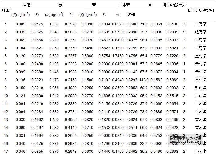 2002年11—12月長春市30個室內(nèi)樣本5項指標(biāo)監(jiān)測數(shù)據(jù)cj(湯紅巖等,2005),以及由式(1)和式(7)計算出的指標(biāo)規(guī)范值x′j如表 11所示.由于樣本1、11~15、26和27的不同指標(biāo)計算得到的規(guī)范值相差較大,因此,在用式(12)計算引力綜合指數(shù)時,需用式(13)對引力指數(shù)值進(jìn)行加權(quán)計算,其余22個樣本的指標(biāo)視作等權(quán),計算得到各樣本引力綜合指數(shù)值,并根據(jù)表 3中空氣環(huán)境質(zhì)量引力指數(shù)分級標(biāo)準(zhǔn)做出評價結(jié)果(表 11).表中還列出文獻(xiàn)(湯紅巖等,2005)中用層次分析評價法做出的評價結(jié)果.由于文獻(xiàn)(湯紅巖等,2005)中的層次分析評價法將室內(nèi)空氣污染劃分為清潔(1*級)、未污染(2*級)、輕污染(3*級)、中污染(4*級)和重污染(5*級)等5級;而本文引力指數(shù)法將其劃分為1級、2級、3級.二者對應(yīng)關(guān)系為:(1*級清潔、2*級未污染)對應(yīng)1級,(3*級輕污染)對應(yīng)2級,(4*級中污染、5*級重污染)對應(yīng)3級.由表 11可以看出,二種方法評價結(jié)果完全一致.