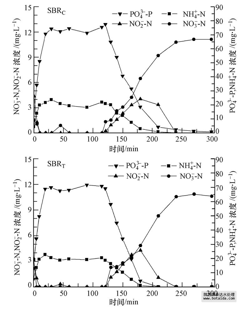 兩套SBR反應(yīng)器穩(wěn)定運(yùn)行狀態(tài)下,出水乙酸鈉和亞硝酸鹽濃度低于檢測(cè)方法的檢出限,出水PO3-4-P,NH+4-N濃度均小于0.5 mg · L-1,反應(yīng)器具有良好的脫氮除磷功能;SBRC反應(yīng)器出水NO-3-N濃度為(12.9±2.2)mg · L-1,SBRT反應(yīng)器出水NO-3-N濃度為(15.3±2.0)mg · L-1.表明TBBPA對(duì)SBR反應(yīng)器硝化和除磷效率沒有太大影響,但對(duì)出水硝態(tài)氮濃度略有影響.