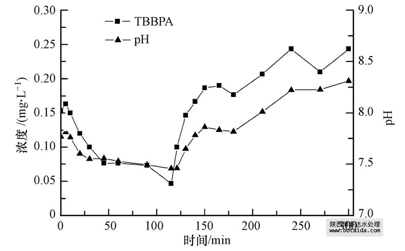 在對(duì)SBRT反應(yīng)周期內(nèi)TBBPA的濃度和pH進(jìn)行相關(guān)性分析時(shí),TBBPA的濃度跟pH有一定線性相關(guān)性,相關(guān)系數(shù)r為0.94.由圖 3所示,厭氧階段,由于強(qiáng)化生物除磷攝取有機(jī)物等反應(yīng),pH有所降低;TBBPA的濃度隨著pH的降低而下降,厭氧結(jié)束時(shí)TBBPA濃度達(dá)到最低0.05 mg · L-1.曝氣開始后,由于曝氣導(dǎo)致二氧化碳等吹脫,pH升高,TBBPA濃度隨著pH的升高而升高.TBBPA隨著pH變化的原因?yàn)門BBPA的溶解度受pH影響較大,當(dāng)pH小于7.5時(shí),TBBPA溶解度很低而主要被活性污泥吸附,而pH增加到8時(shí),TBBPA的溶解度急劇上升,表現(xiàn)為溶液中TBBPA濃度的增加.