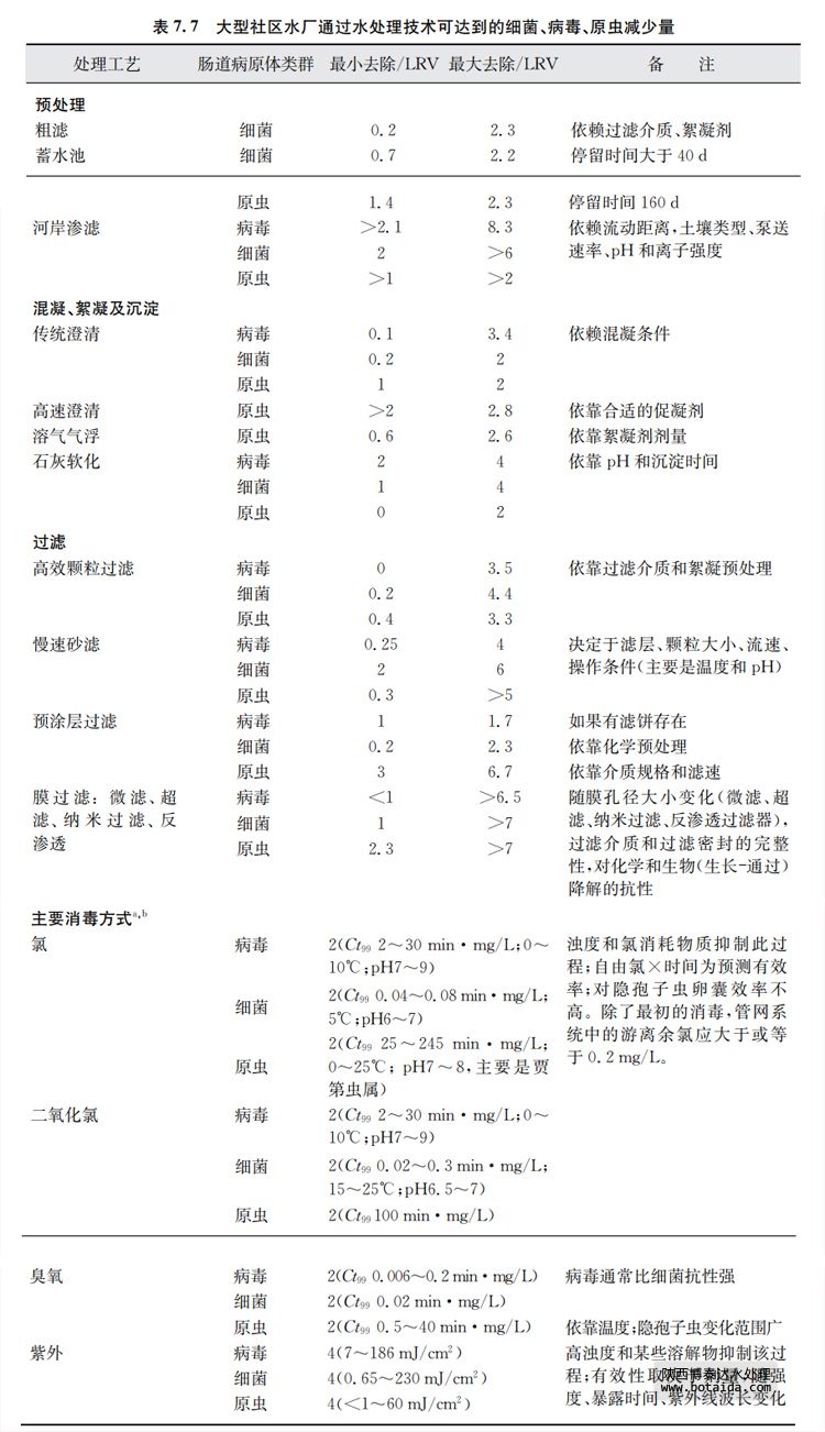 表7.7中列出的微生物降低水平是指微生物的大類群或類別:細(xì)菌、病毒和原蟲(chóng)。由 于各種微生物本身所固有的特性(如大小、外保護(hù)層特性和表面理化性質(zhì)等)不同,因而不同 種類的微生物的處理效果往往存在差異。在這些微生物類群中,處理效果在特定的種、型、 株間差別較小。但這種差別確實(shí)存在,表中針對(duì)各類群微生物中抵抗力強(qiáng)、存活時(shí)間久的病 原體列出了去除的保守估計(jì)。若某一微生物類群中不同的病原體在處理后下降值差別較大 時(shí),則在表中單獨(dú)列出針對(duì)相應(yīng)病原體的處理結(jié)果。