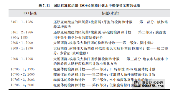國際標(biāo)準(zhǔn)方法在被采納之前應(yīng)根據(jù)當(dāng)?shù)氐木唧w情況進(jìn)行評估??梢允褂靡呀⒌臉?biāo)準(zhǔn) 方法,如國際標(biāo)準(zhǔn)化組織(ISO)(見表7.11)的方法或效果及可靠性與其相當(dāng)?shù)姆椒ň刹?用。對于常規(guī)檢測可采用那些已建立的方法。無論選用何種方法檢測埃希氏大腸桿菌或耐 熱性大腸菌群,都必須考慮因環(huán)境或消毒劑受到損傷的微生物菌株的“復(fù)蘇”或“恢復(fù)”問題。
