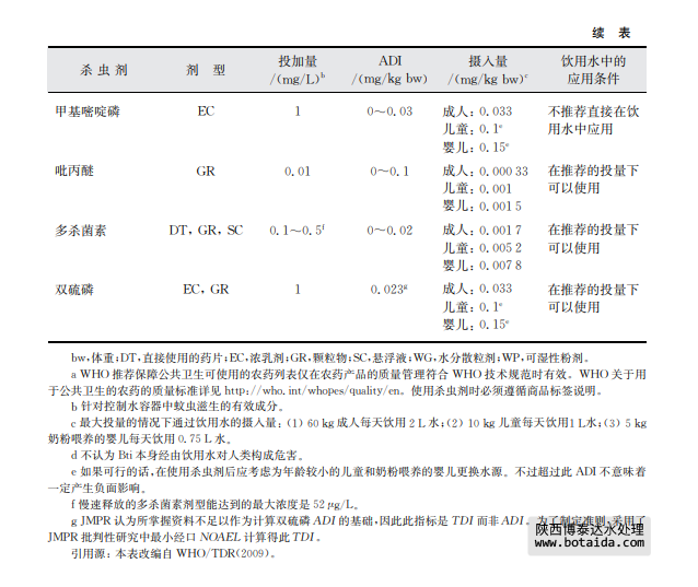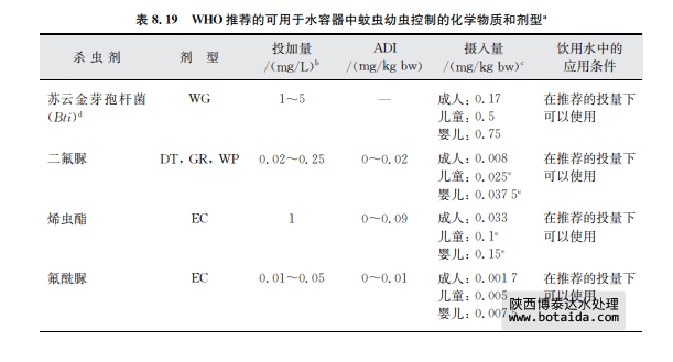 WHOPES對(duì)因公共衛(wèi)生目的使用的農(nóng)藥進(jìn)行了評(píng)價(jià)。目前,WHOPES已評(píng)估并列出的 可在容器中控制蚊蟲(chóng)幼卵的包括七種殺幼蟲(chóng)劑(二氟脲、烯蟲(chóng)酯、氟酰脲、甲基嘧啶磷、吡丙醚、 多殺菌素和雙硫磷)和一種細(xì)菌殺蟲(chóng)劑(蘇云金芽孢桿菌,犅?tīng)釥銧闋鞝鞝鯛鬆魻锠鯛驙闋顮鐮闋鍫顮鬆闋鬆闋鬆驙釥鍫鞝鍫顮鬆闋螅?br /> 雖然沒(méi)必要為以控制攜菌體為目的的農(nóng)藥設(shè)定準(zhǔn)則值,但有必要就它們使用時(shí)的安全 性提供足夠的信息。用于飲用水?dāng)y菌體控制的農(nóng)藥劑型必須嚴(yán)格遵守商品標(biāo)簽建議,并且 包括從材料到配制最終產(chǎn)品的配方組分,一定要使用國(guó)家主管部門(mén)批準(zhǔn)可用于此用途的產(chǎn) 品。為制定準(zhǔn)則評(píng)估控制攜菌體的農(nóng)藥時(shí),評(píng)價(jià)報(bào)告主要由犃犇犐與潛在暴露風(fēng)險(xiǎn)的比較組 成。不過(guò),超過(guò)犃犇犐的攝入不一定意味著會(huì)對(duì)健康產(chǎn)生負(fù)面影響。由于攜菌體傳播的疾病 有很高的發(fā)病率和死亡率,控制病原昆蟲(chóng)與飲用水?dāng)z入農(nóng)藥量之間必須找到一個(gè)合適的平 衡。需要強(qiáng)調(diào)的是,應(yīng)努力使總攝入量和任何殺幼蟲(chóng)劑的濃度都低于 WHOPES的推薦水 平,并且在具有足夠的效力條件下盡可能低。