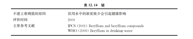 由于鈹非常罕見,如果曾經(jīng)出現(xiàn)過在飲用水中發(fā)現(xiàn)了有危害的濃度,也沒必要為它建立 一個(gè)正式的飲用水準(zhǔn)則。 以一個(gè)長期的關(guān)于犬類的小腸損傷的研究作為毒性終點(diǎn),假設(shè)飲用水犜犇犐配額取 20%,一個(gè)體重60kg的成年人每天飲用2L水,犜犇犐?。?mu;g/kgbw可計(jì)算出飲用水中鈹?shù)慕】禈?biāo)準(zhǔn)為12μg/L。這個(gè)分配定額可能是保守的,因?yàn)閬碓从谑澄锝佑|的有限數(shù)據(jù)表明此 來源可能遠(yuǎn)低于犜犇犐值。 盡管鈹似乎在飲用水源和飲用水中存在濃度都很低,水中濃度的數(shù)據(jù)有限,但也會(huì)存在 可能的特殊情況,自然條件中pH值低于5或者高于8或者高濁度的情況下鈹濃度會(huì)有所 升高。