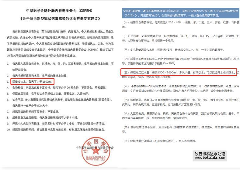中國營養(yǎng)學會、中華醫(yī)學會、地方衛(wèi)健委等機構發(fā)布的“防治新冠病毒感染的飲食指南”中,也多次提到要保證每天1500ml~2000ml的飲水量,多次少量,有效飲水。