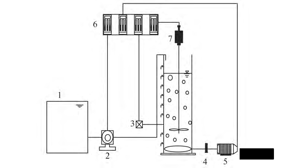 1. 進(jìn)水箱; 2. 蠕動(dòng)泵; 3. 出水; 4. 氣體流量計(jì); 5. 鼓風(fēng)機(jī) 6. 進(jìn)水、出水、攪拌、曝氣時(shí)序控制器; 7. 攪拌機(jī)