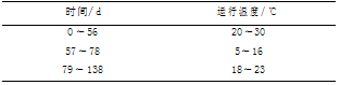 反應(yīng)器每天運(yùn)行 4 個(gè)周期,每個(gè)周期 6 h,分為: 進(jìn)水 10 min,厭氧 80 min,好氧 210 min,沉淀 ( 30 ~ 3) min( 沉淀時(shí)間在顆粒培養(yǎng)階段逐漸由 30min 遞減至 3 min,顆粒成熟之后保持 3 min) ,排水 10 min,剩余時(shí)間閑置,反應(yīng)器換水比為 75% . 運(yùn)行過(guò)程中對(duì) pH 不做控制,控制曝氣流量為 1. 50L·min - 1 ,運(yùn)行溫度變化如表 1 所示.