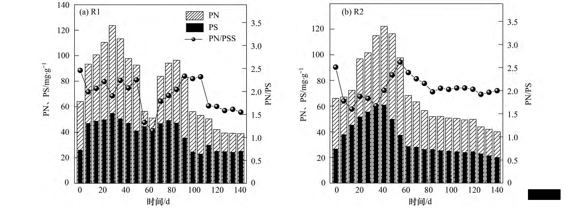 圖 4 R1 和 R2 反應(yīng)器中 PN、PS 和 PN / PS 值的變化
