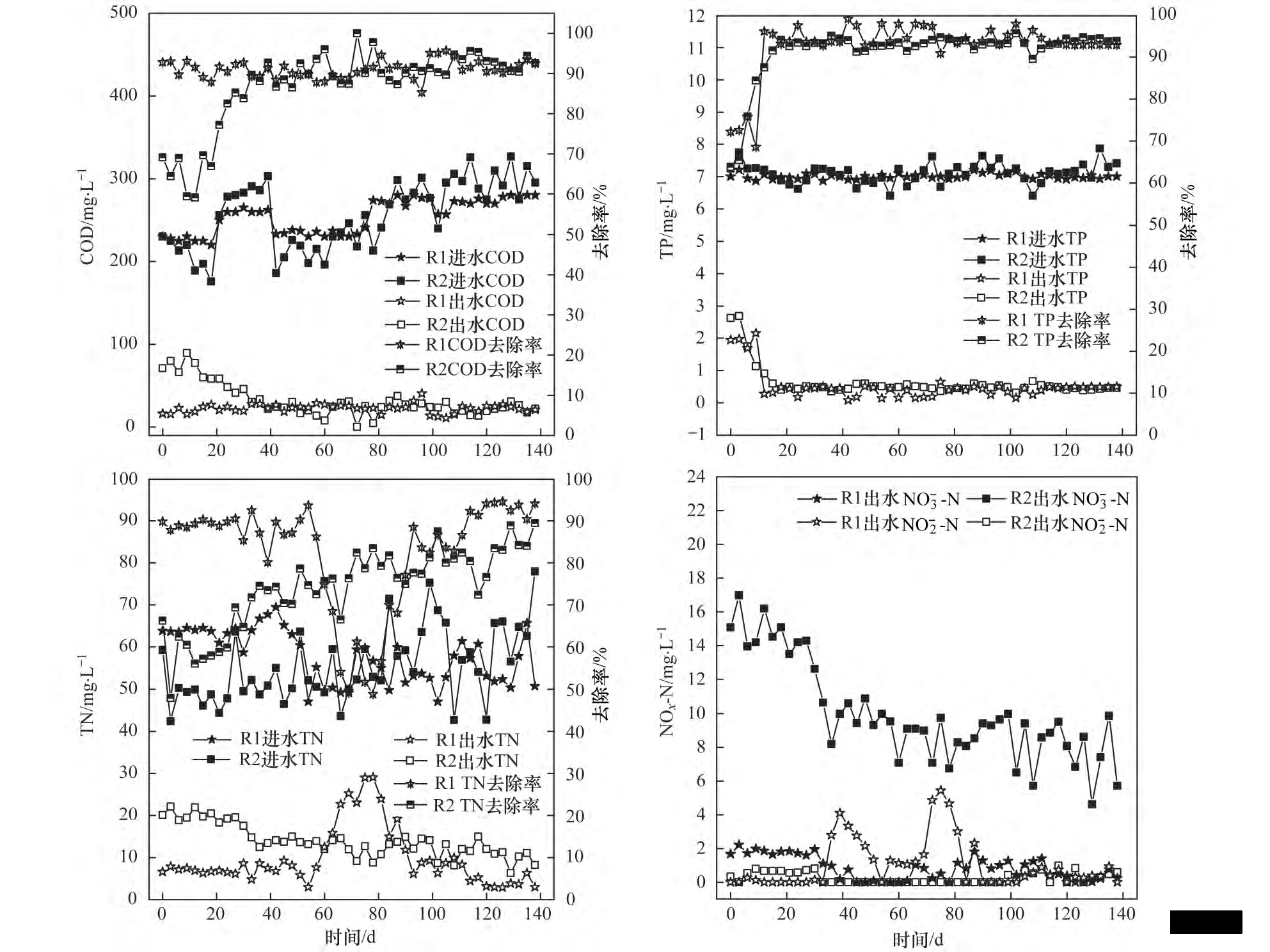 圖 5 R1 和 R2 反應(yīng)器去除 COD、TP、TN 和 NO - -N 的性能