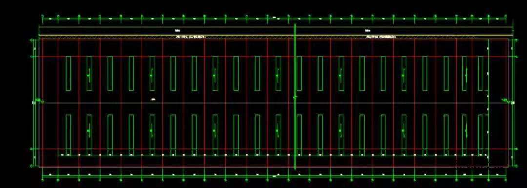 舊熟料堆棚長約 165.5,寬 45 米,高 12 米的料倉。沿兩邊立柱上方跨梁噴設,跨梁共計數(shù)量 24 個、鋪設 23 個,共計長度約 1035 米。