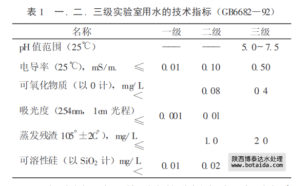 國(guó)家標(biāo)準(zhǔn)規(guī)定有分析實(shí)驗(yàn)室用水的技術(shù)指標(biāo)。分析實(shí)驗(yàn)室用水的技術(shù)指標(biāo)見(jiàn)下表,