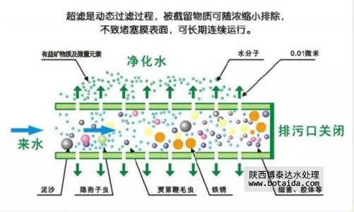 自來水從濾芯端面進(jìn)入到超濾膜內(nèi)后,在正常水壓的作用下,凈水從超濾膜管壁滲出,而泥沙、鐵銹、膠體、細(xì)菌、懸浮物、大分子有機(jī)物等有害物質(zhì)被截留在超濾膜管內(nèi),并在用戶使用直通自來水或?qū)V芯進(jìn)行沖洗和反沖洗時(shí)從直通自來水出口排出。