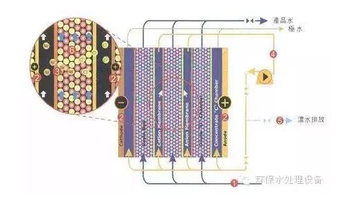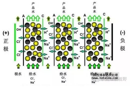 EDI膜堆主要由交替排列的陽(yáng)離子交換膜、濃水室、陰離子交換膜、淡水室和正、負(fù)電極組成。離子交換樹脂充夾在陰陽(yáng)離子交換膜之間形成單個(gè)處理單元,并構(gòu)成淡水室,單元與單元之間用網(wǎng)狀物隔開,形成濃水室。在直流電場(chǎng)的作用下,淡水室中離子交換樹脂中的陽(yáng)離子和陰離子沿樹脂和膜構(gòu)成的通道分別向負(fù)極和正極方向遷移,陽(yáng)離子透過陽(yáng)離子交換膜,陰離子透過陰離子交換膜,分別進(jìn)入濃水室形成濃水。同時(shí)EDI進(jìn)水中的陽(yáng)離子和陰離子跟離子交換樹脂中的氫離子和氫氧根離子交換,形成超純水(高純水)。超極限電流使水電解產(chǎn)生的大量氫離子和氫氧根離子對(duì)離子交換樹脂進(jìn)行連續(xù)的再生。傳統(tǒng)的離子交換,離子交換樹脂飽和后需要化學(xué)間歇再生。而EDI膜堆中的樹脂通過水的電解連續(xù)再生,工作是連續(xù)的,不需要酸堿化學(xué)再生。